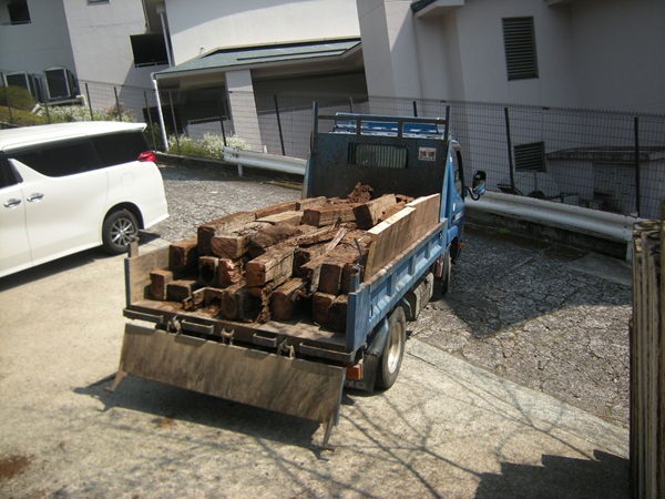 枕木の撤去&処分 お庭の踏み石の代わりに置かれていた枕木の撤去と処分を承りました。 かなりの油分が浸み込んでいましたので、再処分費用は持込先の判断次第です。 はじめに軽トラック1台分持込み、再処分金額を確認したうえで、残り大半のお取引金額を提示しました。